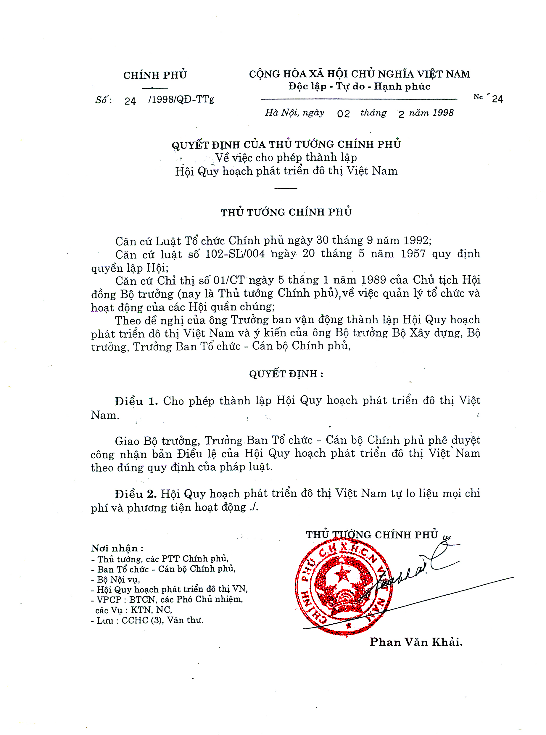 Vietnam Urban Planning and Development Association – English name: Vietnam Urban Planning and Development Association, abbreviated name is VUPDA, the Association was established under Decision No. 24/1998 / QD-TTg, issued by the Prime Minister. February 2, 1998. The Vietnam Urban Planning Association is a socio-professional organization that brings together people working in urban planning and development throughout the country, voluntarily striving for the purpose of construction and develop Vietnam’s urban areas in a sustainable manner, in the direction of industrialization and modernization. With the main role of a social criticism consultant, the Association operates nationwide, on the principle of complying with the provisions of the law, to contribute to building and protecting the Socialist Vietnam Fatherland.